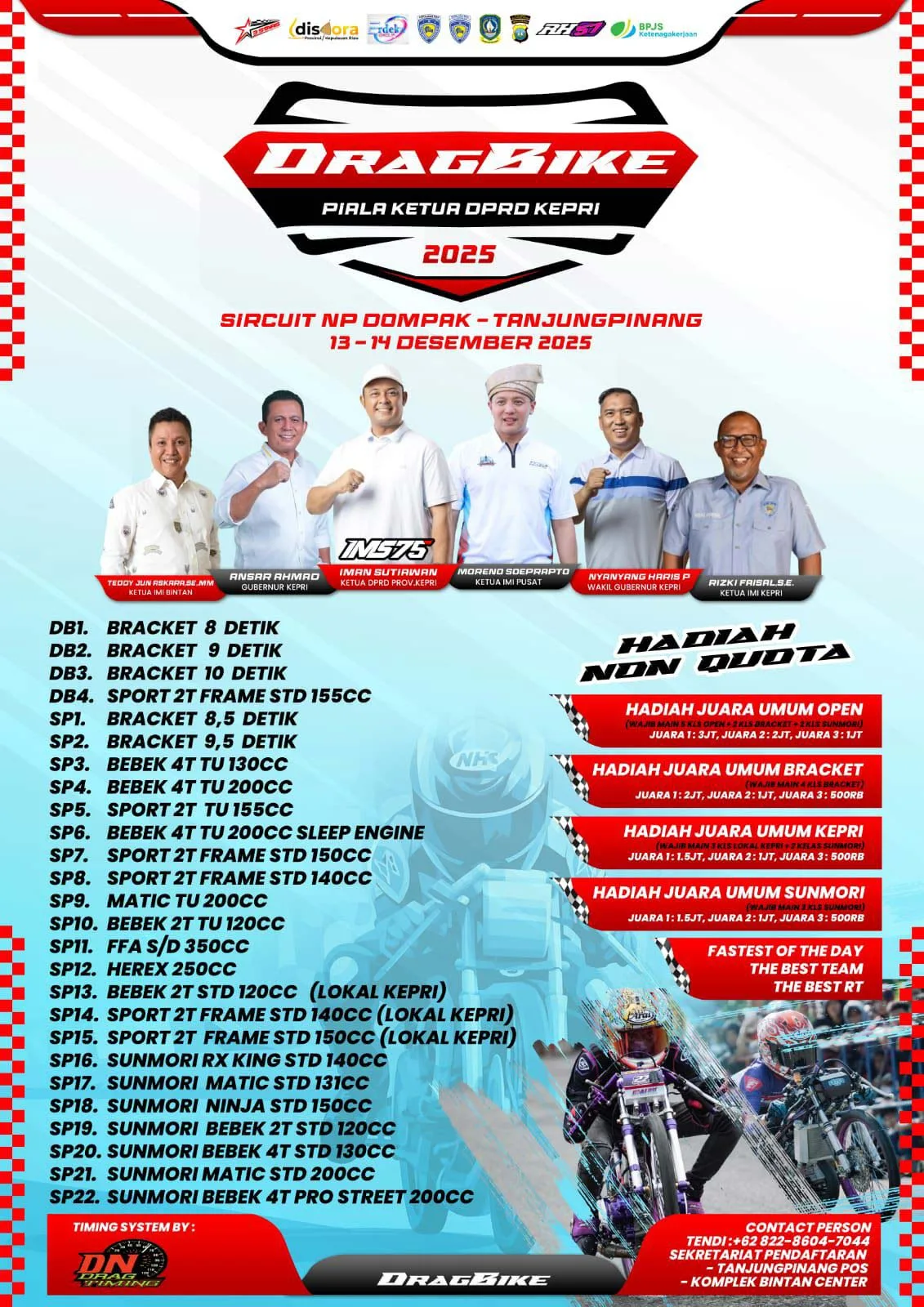 BalapMotor.Net – Jelang gelaran Drag Bike Piala Ketua DPRD Kepri 2025 yang akan berlangsung di Sirkuit NP Dompak, Tanjungpinang, Kepulauan Riau pada 13–14 Desember 2025, skuad 36 People X Wanbros tampil total. Mereka menggandeng SAG Management untuk penyediaan pacuan sekaligus line up joki.