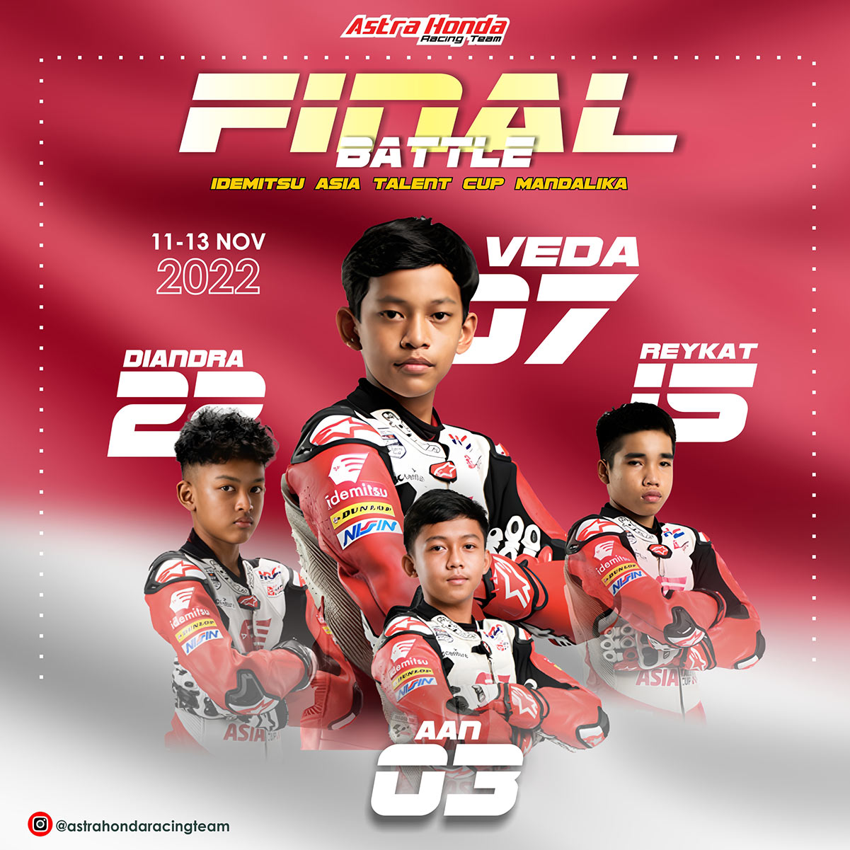 BalapMotor.Net – Gelaran balap Idemitsu Asia Talent Cup (IATC) sudah memasuki putaran final. Digelar di sirkuit Internasional Mandalika pada 11-13 November mendatang. Astra Honda Racing Team menerjunkan 4 pembalap regular. Dua diantaranya mempunyai kans besar juara Mandalika dan berebut posisi 3 besar IATC musim 2022.