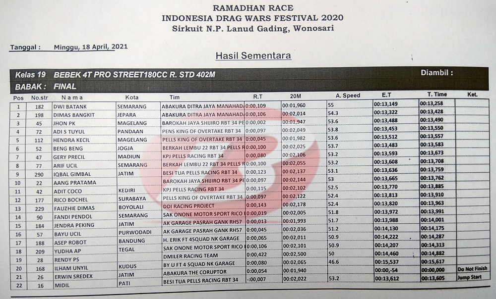 Pembalap asal Semarang tersebut mencatatkan waktu tercepat 13.258 detik dengan spek MX-King Abakura Ditrajaya Manahadap. Tak hanya Batank, motor racikan Wawan ini juga meraih posisi kedua lewat Dimas Bangkit.