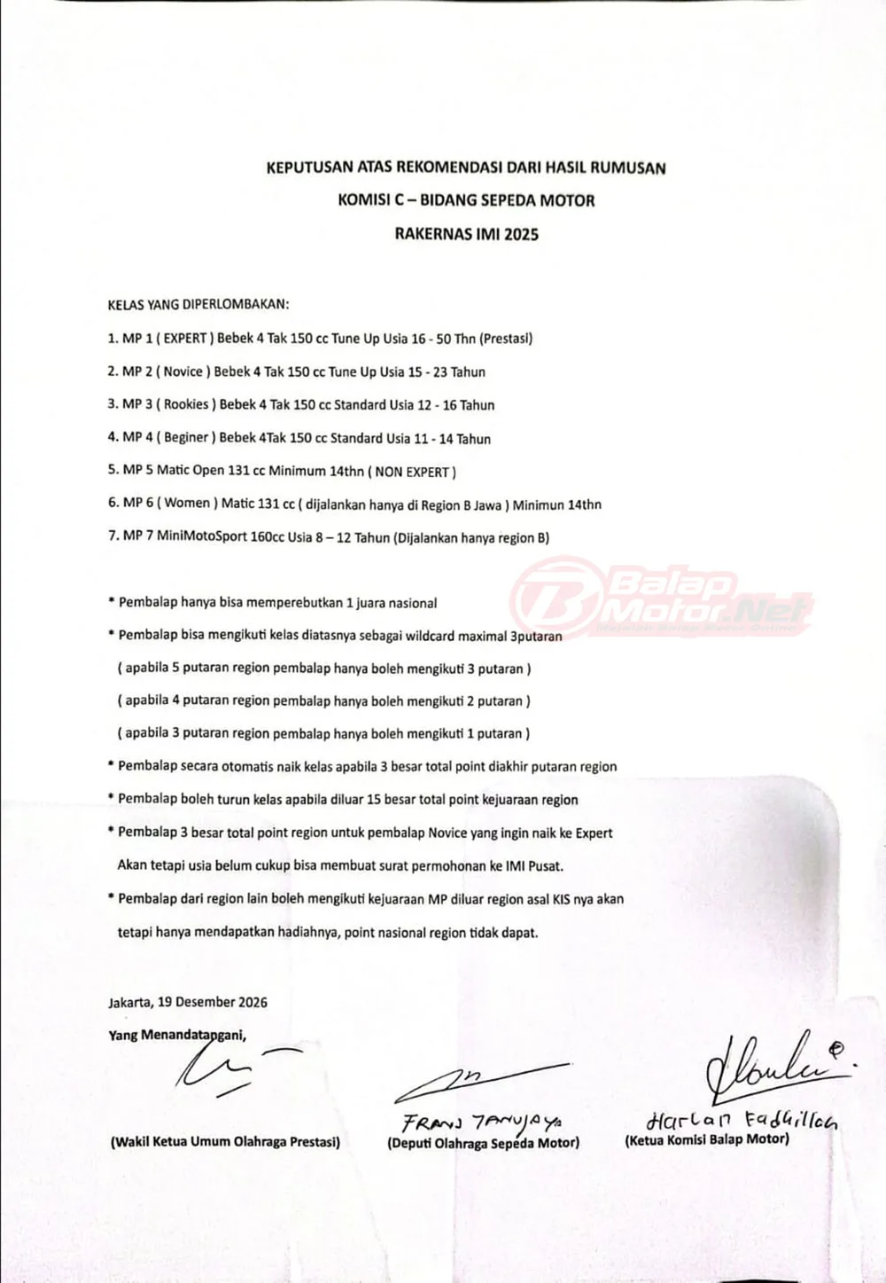 BalapMotor.Net – Pada penghujung tahun 2025, Pengurus Pusat Ikatan Motor Indonesia (PP IMI) resmi mengeluarkan pembaruan regulasi terkait pengkategorian rider serta kelas yang akan diterapkan pada ajang Kejuaraan Nasional (Kejurnas) Motoprix musim mendatang.