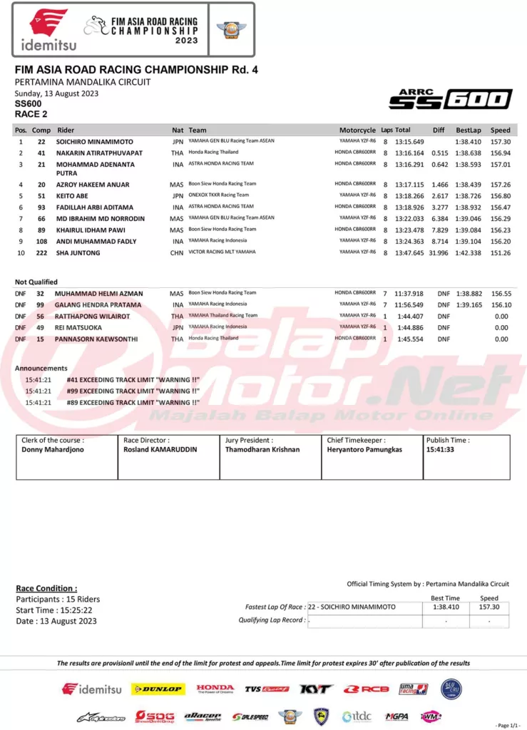 BalapMotor.Net – Pebalap Astra Honda Racing Team (AHRT) di kelas Supersports 600 (SS600), M. Adenanta Putra berhasil meraih podium pertamanya di kejuaraan Asia Road Racing Championship (ARRC) 2023.
