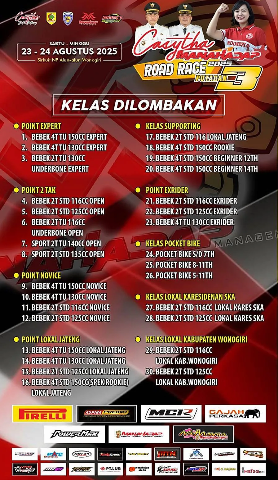 Tepatnya di sirkuit NP. Alun-alun Wonogiri pada tanggal 23-24 Agustus 2025. Catat dan ramaikan ya bolo. Selalu special ajang garapan Manahadap Management ini ketika mampir di Wonogiri.