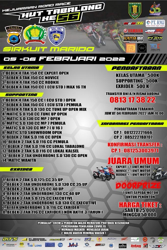 Acara akan berlangsung pada 5-6 Februari 2022 dan bertempat di sirkuit Marido yang berada di Tabalong, Kalsel. Event ini akan menyajikan 26 kelas yang terdiri dari kelas utama, supporting dan exrider.