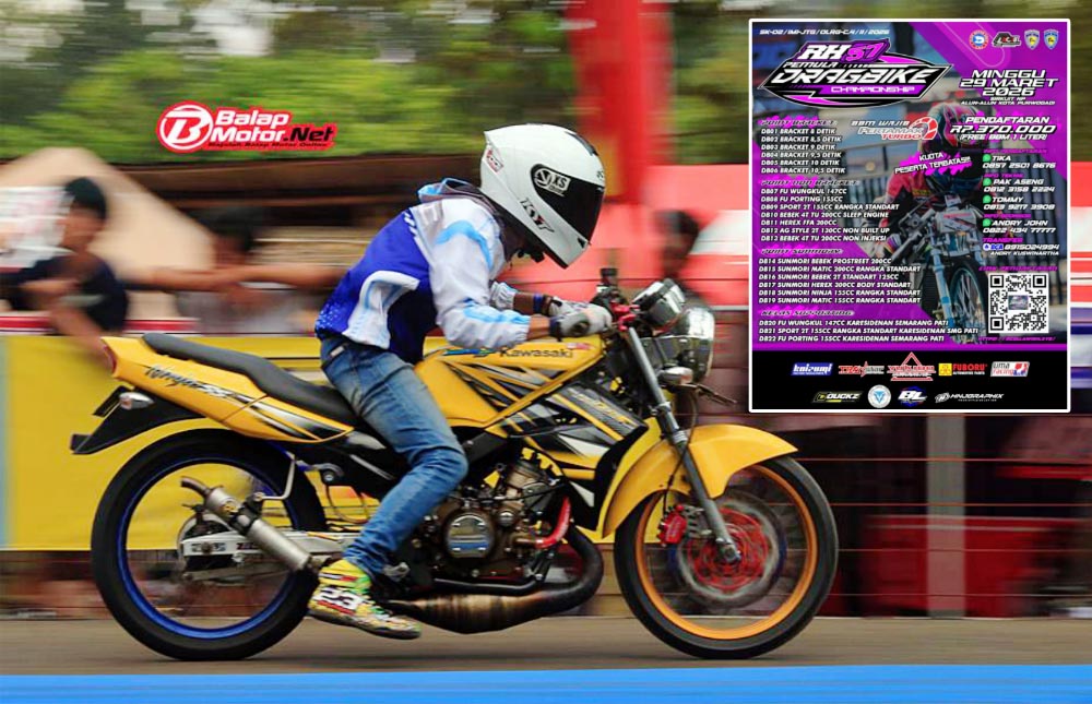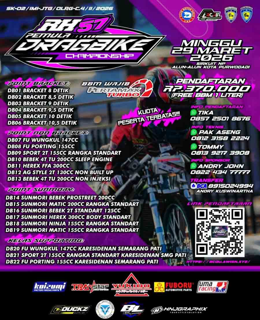 BalapMotor.Net – Pecinta balap lurus area plat K, wajib merapat nih ke Purwodadi. Minggu ini, 29 Maret akan tersaji Kejuaraan RH57 Pemula Drag Bike Championship 2026.