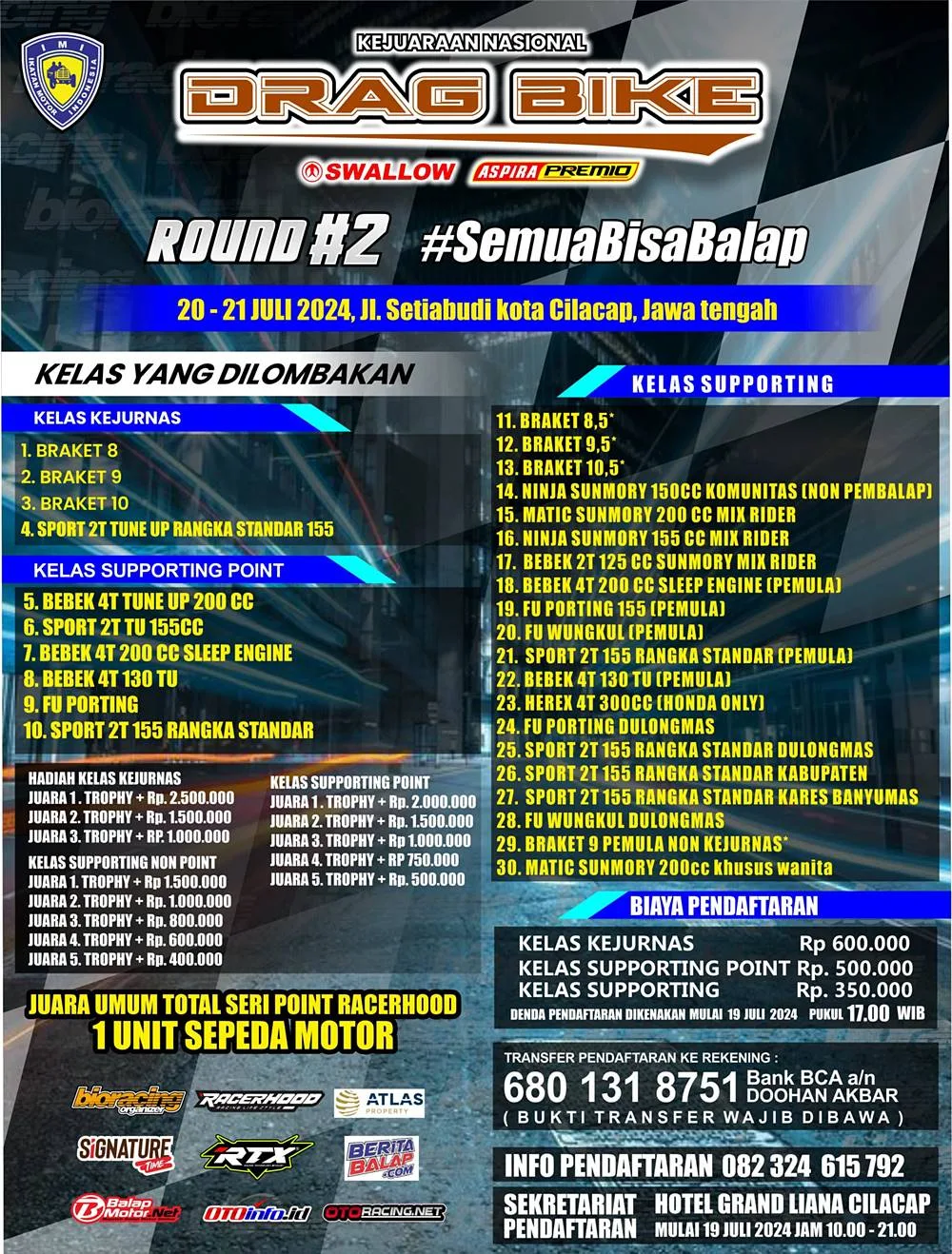 Itu kelas utama! Yang mana siapa saja bisa balap. Khusus kelas bracket tentunya tidak perlu punya motor kencang, yang penting ketepatan dan kejelian dalam mancatat waktu.