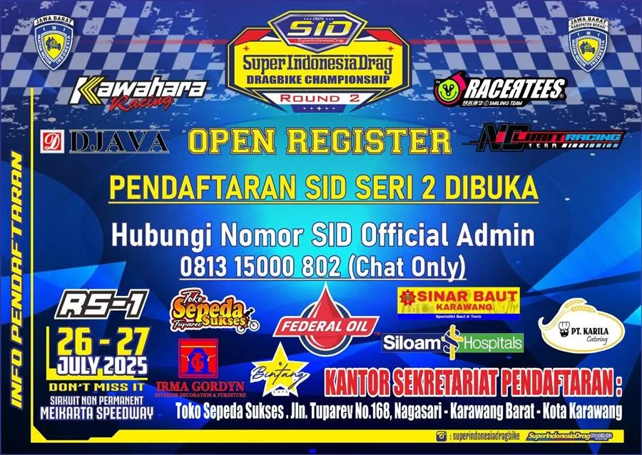 BalapMotor.Net – Gelaran Super Indonesia Drag “SID” Drag Bike Championship 2025 kini akan memasuki Round 2 yang akan digelar akhir pekan ini, 26-27 Juli di sirkuit Meikarta Speedway Bekasi.