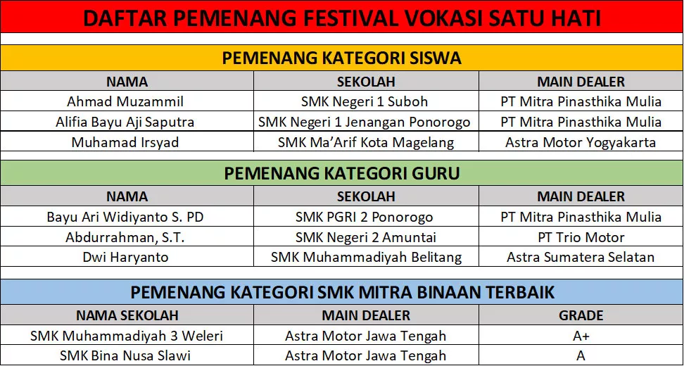 “Dengan semangat Sinergi Bagi Negeri, beragam upaya pengembangan SMK mitra binaan terus kami jalankan. Festival Vokasi Satu Hati ini adalah puncak dari upaya kami bersama jaringan main dealer melakukan pendampingan dan inovasi agar proses belajar mengajar ini dapat menghasilkan lulusan yang kompeten dan siap di dunia kerja” ujar Muhib. (Rls)