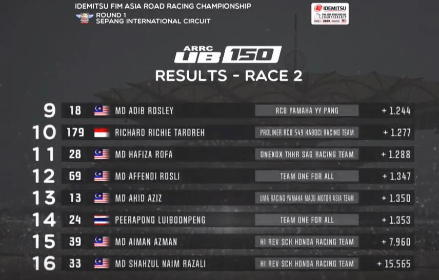 Pembalap dengan nomor start sama dengan Rossi yaitu #46 makanya kita sebut Valentino Rossinya Malaysia ini mampu menang tipis dari Md Izzat Zaidi dari RCB Yamaha YY Pang yang finish kedua.