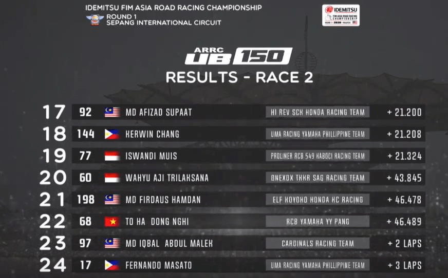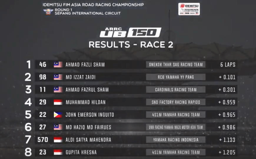 Fazli Sham yang membela tim ONEXOX TKKR SAG RT ini sendiir juga mengalahkan adiknya yaitu Ahmad Fahrul Sham dari Cardilans RT yang finish ketiga. Sementara Muhammad Hildan dari SND Factory Racing Rapido berhasil finish di posisi keempat dan menjadi pembalap Indonesia terbaik pada race ini.