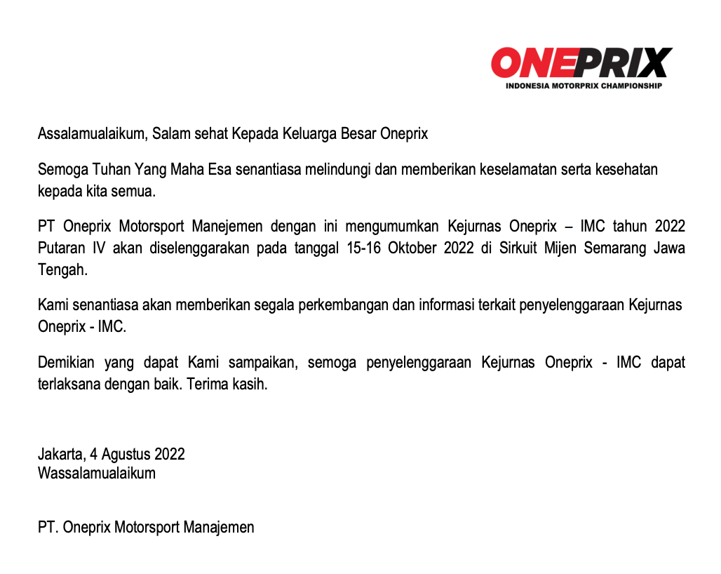 Hal ini pastinya setelah pihak Pemkot Semarang, IMI Jateng dan juga OMM selaku penyelenggara Oneprix melakukan pembicaraan yang dilanjutkan dengan perbaikan pada sirkuit Mijen agar bisa sesuai standar yang ditentukan oleh OMM.