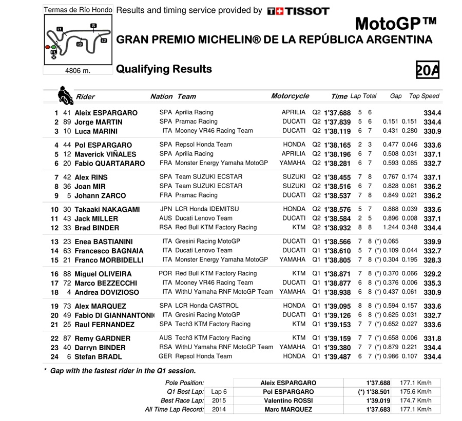 Hasil ini pun menjadi pole position pertama bagi Aprilia di era baru dan pertama bagi Aleix Espargaro sejak GP Catalan 2015. Sementara adik Aleix yaitu Pol Espargaro (Repsol Honda) yang berjuang dari Q1 juga sukses tampil bagus dan berhasil mengamankan urutan keempat.