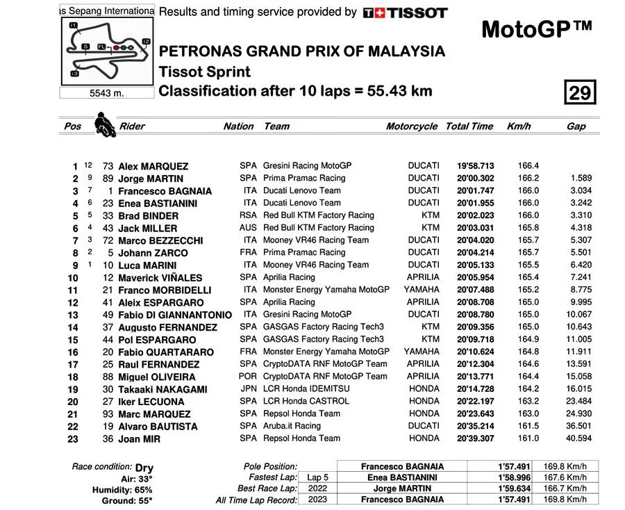 Jorge Martin yang menempati posisi kedua cukup puas lantaran berhasil memperkecil jarak poinnya dengan Pecco. Pada balapan sprint race kali ini, dominasi Ducati masih terus berlanjut.