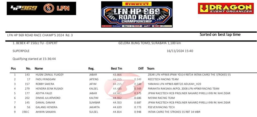 BalapMotor.Net – Alfi Husni meraih hasil cukup memuaskan pada sesi kualifikasi dan Superpole putaran final LFN HP969 Road Race Championship 2024 yang berlangsung di sirkuit GBT Surabaya (16/11).