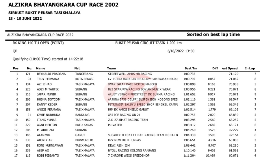 BalapMotor.Net – Reynaldi Pradana tampil oke dalam jalannya QTT kejuaraan balap motor bertajuk Alzikra Bhayangkara Cup Race 2022 yang berlangsung di sirkuit Bukit Peusar, Tasikmalaya (18/6).