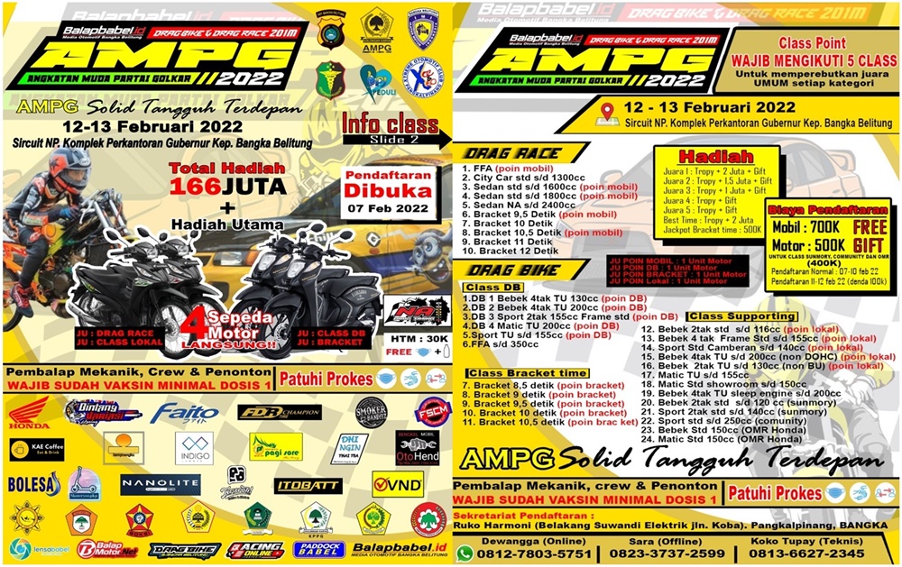“Kita fix bakal gelar AMPG Drag Bike & Drag Race 201M 2022 pada tanggal 12-13 februari 2022 dan akan memakai sirkuit NP. Kompleks Perkantoran Gubernur Bangka Belitung, untuk hadiahnya sendiri total ada 166 juta dan 4 unit sepedah motor langsung keluar tanpa adanya seri atau putaran,” tambahnya.