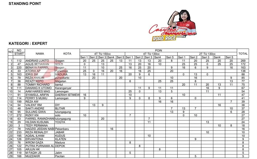 Itu kategori poin utama yang berisikan tiga kelas, yaitu MP1, Bebek 4T TU 130cc dan Underbone 130cc. Selama lima putaran berlangsung, Dias sapaannya tampil paling konsisten.
