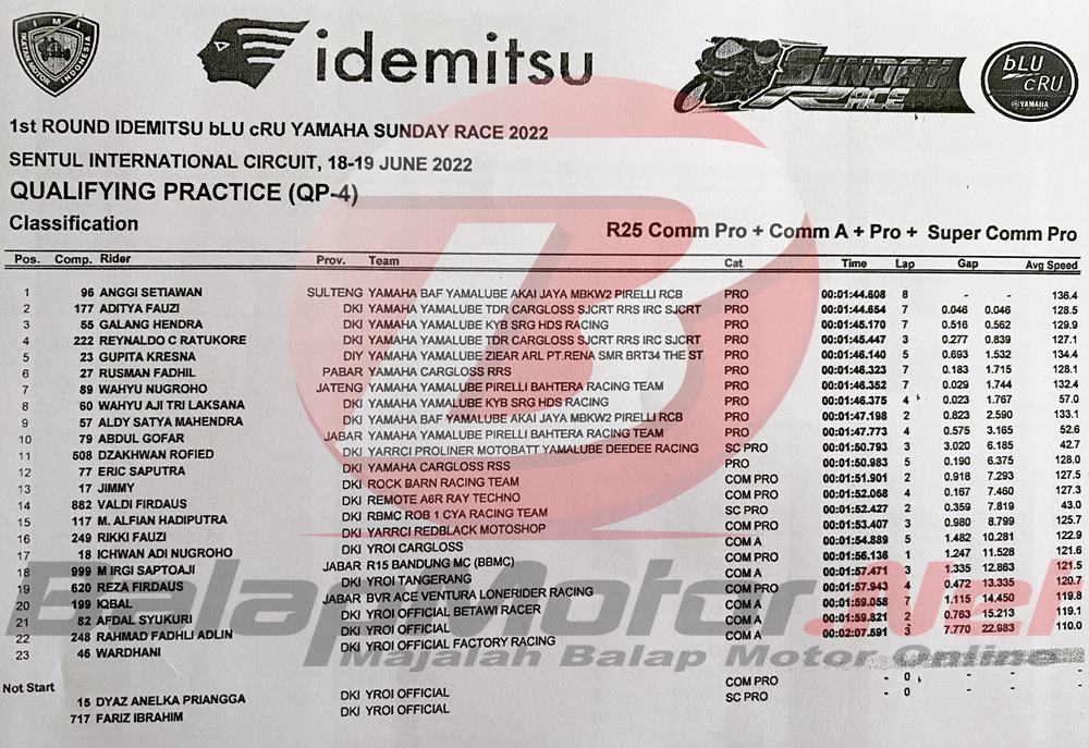 BalapMotor.Net – Anggi Setiawan, pembalap asal Palu yang membela pasukan Yamaha BAF Yamalube Akai Jaya MBKW2 Pirelli RCB berhasil memberikan kejutan dalam sesi QTT R25 Pro seri 2 Idemitsu bLU cRU Yamaha Sunday Race (YSR) 2022.