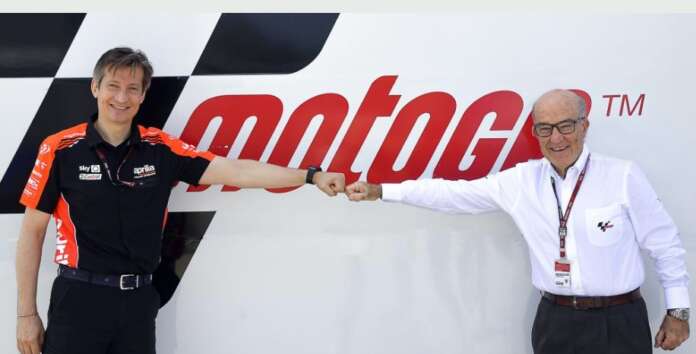 BalapMotor.Net – Aprilia telah menandatangani perjanjian baru dengan Dorna Sports untuk tetap berada di kelas utama selama lima tahun lagi atau sampai 2026. Dorna Sports dengan bangga mengumumkan penandatanganan perjanjian itu.