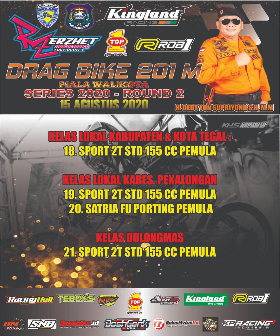 Dengan tajuk Gadhuro Erzhet Kingland TOP1 ROB1 Drag Bike Series 2020 Round 2 (Piala Walikota), event yang sudah kita tunggu-tunggu ini rencana akan berlangsung di sirkuit Jl. Lingkar Utara kota Tegal pada 15 Agustus besok.