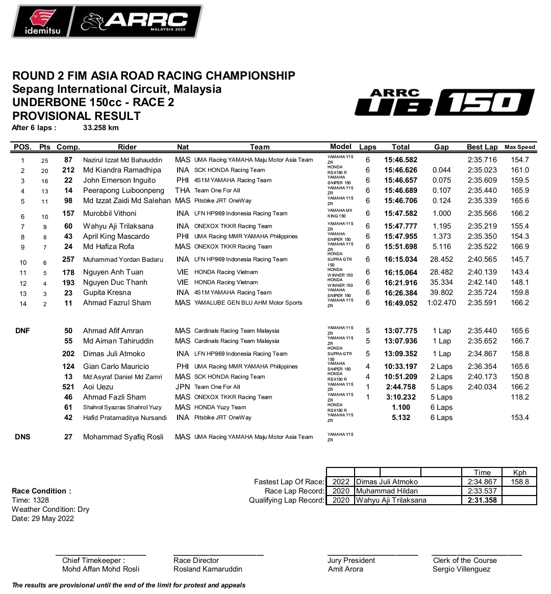 Berikut hasil Race 2 Underbone 150cc: