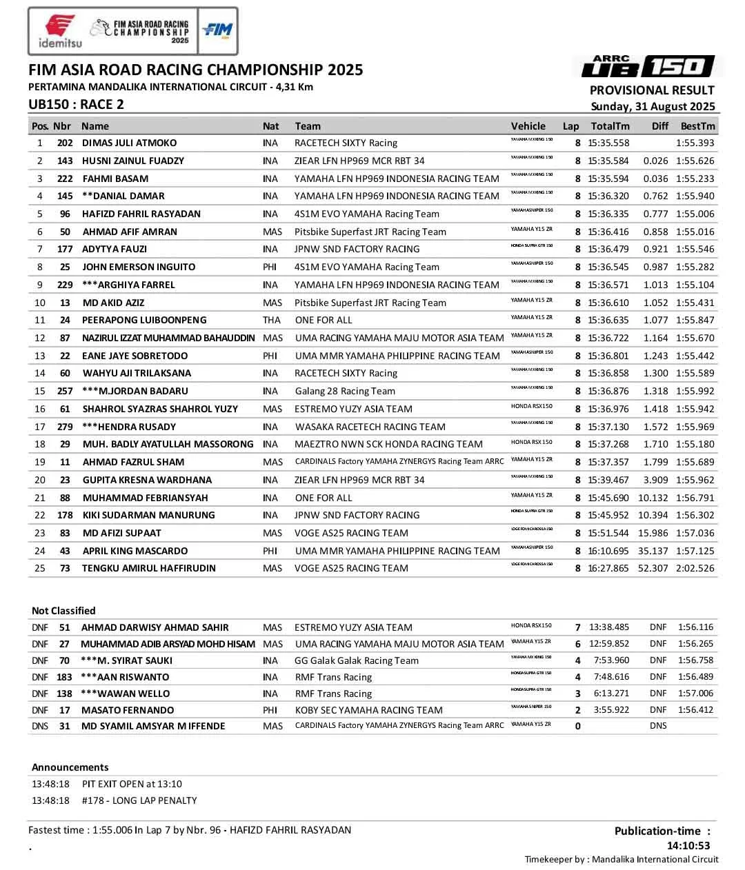Hasil Race 2 UB150 ARRC Mandalika:
