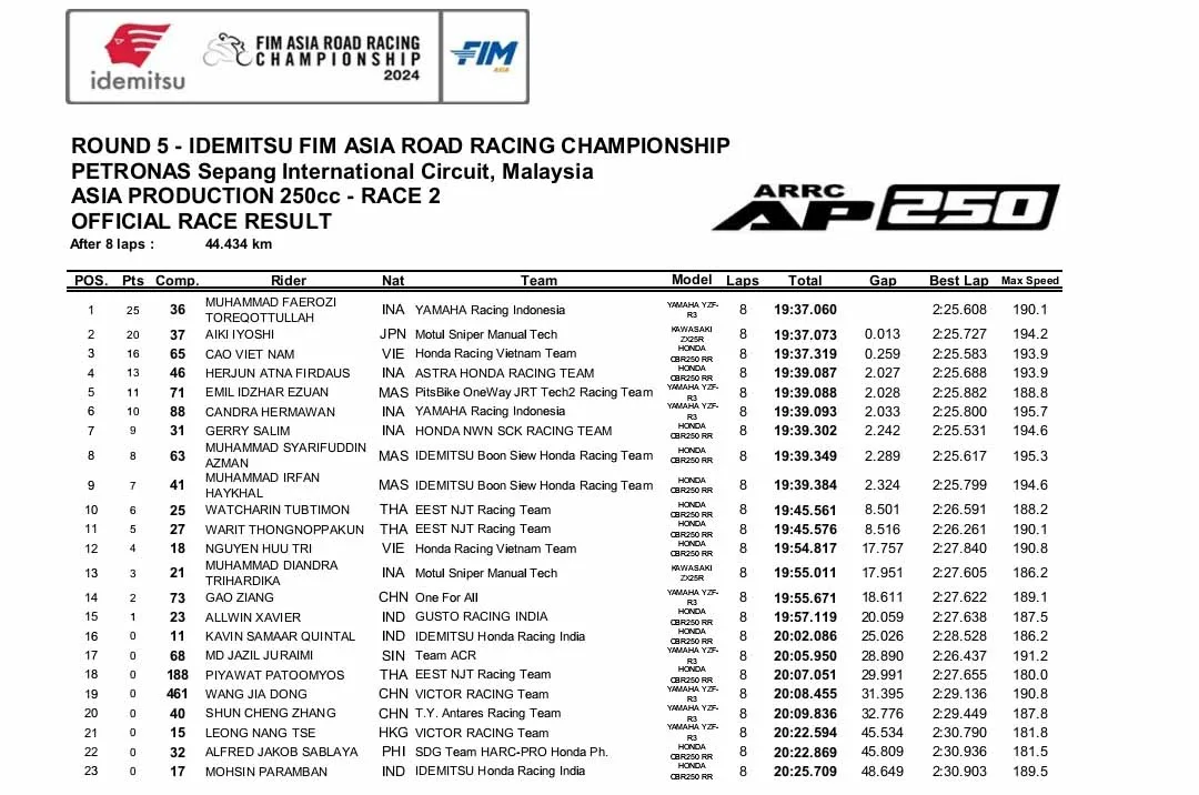 BalapMotor.Net – M Faerozi berhasil mengamankan podium juara di Race 2 Asia Production (AP250) Asia Road Racing Championship (ARRC) 2024 putaran kelima yang berlangsung di sirkuit Sepang, Malaysia.