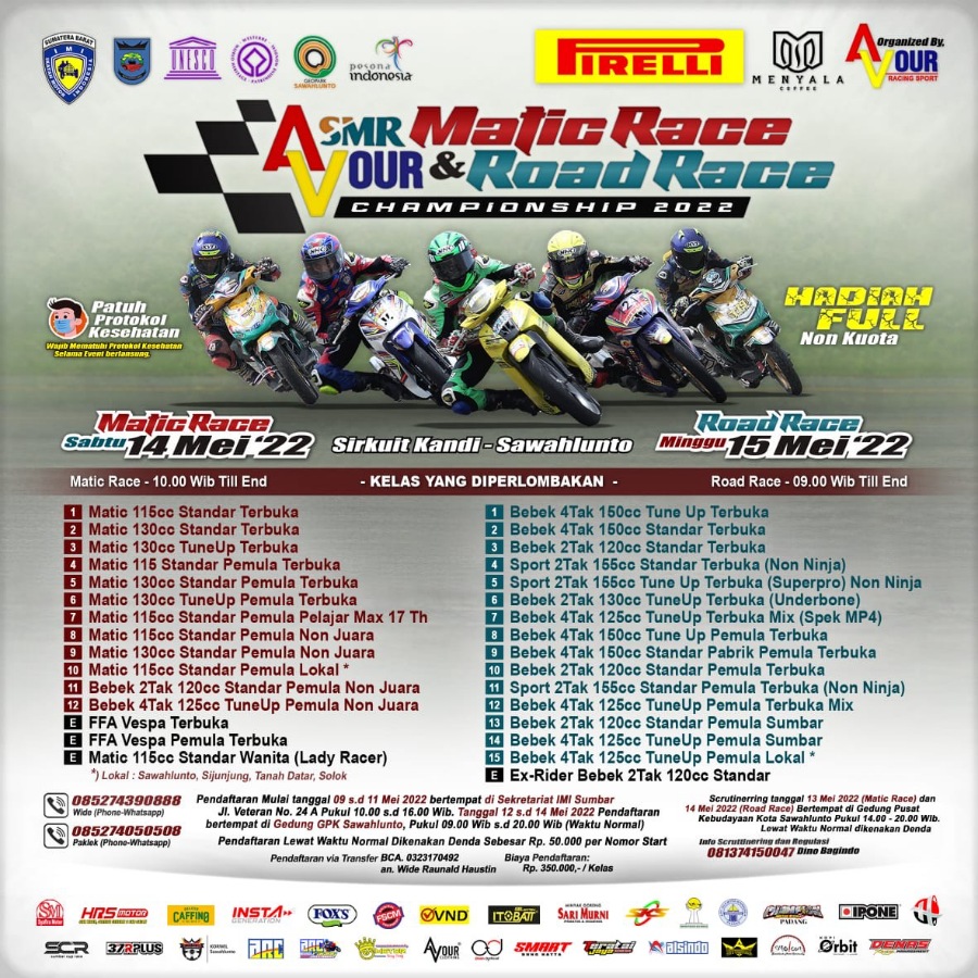So, catat tanggalnya dan jangan sampai lewatkan ya. Ikuti dan saksikan Balap Motor PIRELLI AVOUR SMR MATIC RACE & ROAD RACE CHAMPIONSHIP 2022 bakal digelar akhir pekan ini di sirkuit Permanen Kandi Sawahlunto, Sumbar. |Halim