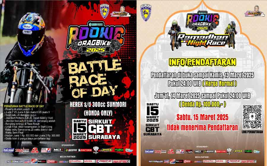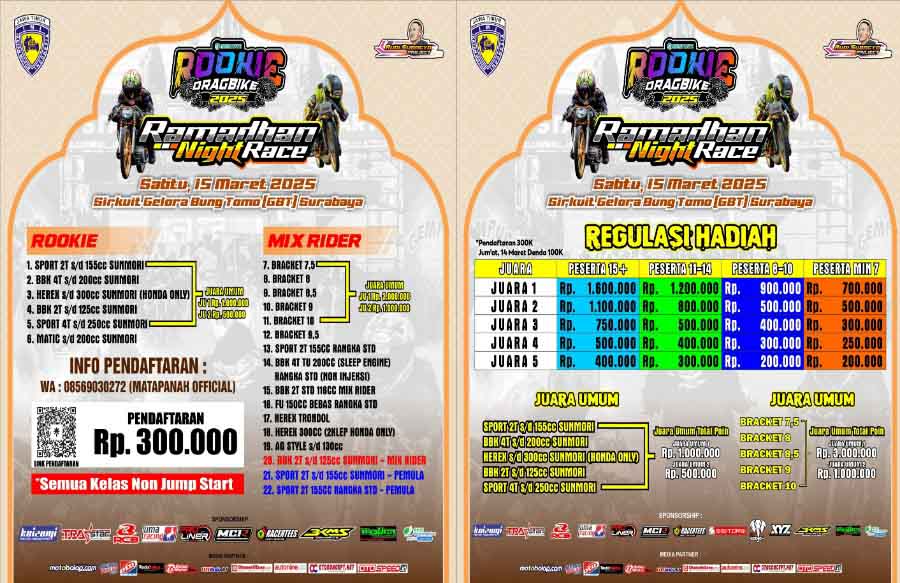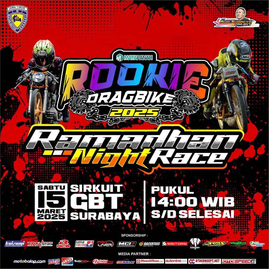 BalapMotor.Net – Perdana untuk tahun ini ajang Matapanah Rookie Dragbike akan terselenggara di bulan Ramadhan, tepatnya pada Sabtu 15 Maret 2025 di Sirkuit Internasional Bung Tomo Surabaya, Jawa Timur.