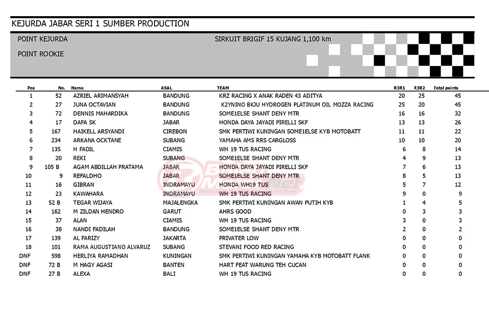 Poin keduanya sama yaitu 45, namun Azriel yang berhasil mendapatkan hadiah juara 1 karena jadi jawara pada race 2. Perlu diketahui juga bahwa pertarungan Rookie di Kejurda Cimahi sendiri diikuti oleh 21 rider belia, ini merupakan jumlah yang istimewa. (**)