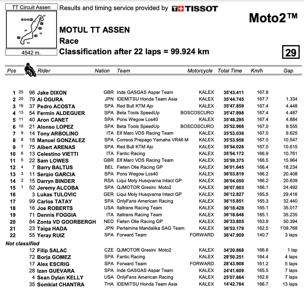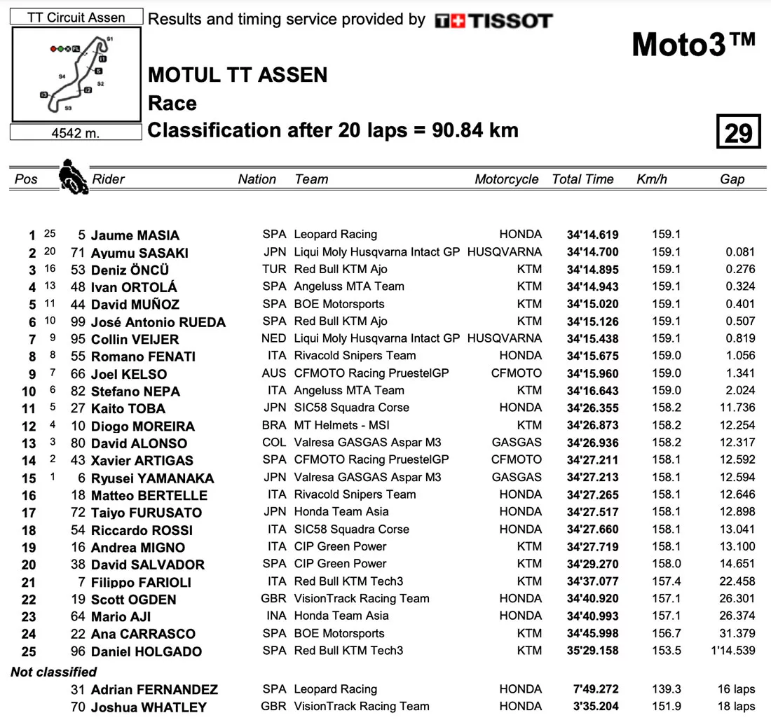 Sementara itu, Brand Binder (Red Bull KTM Factory) yang sebenarnya finish ketiga akhirnya gagal menapaki podium.