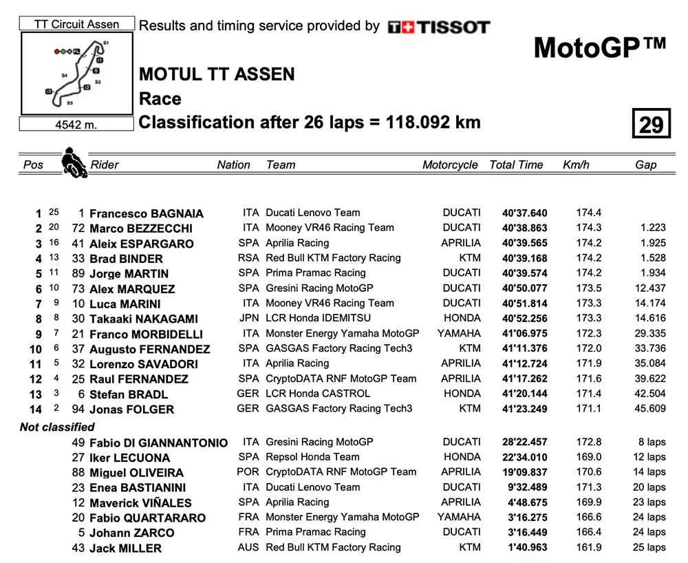 Andalan Ducati Lenovo Team ini berhasil mengungguli Marco Bezzecchi (Mooney VR46)yang finish kedua. Kemenangan ini sendiri menjadi kemenangan keempat dalam musim ini.