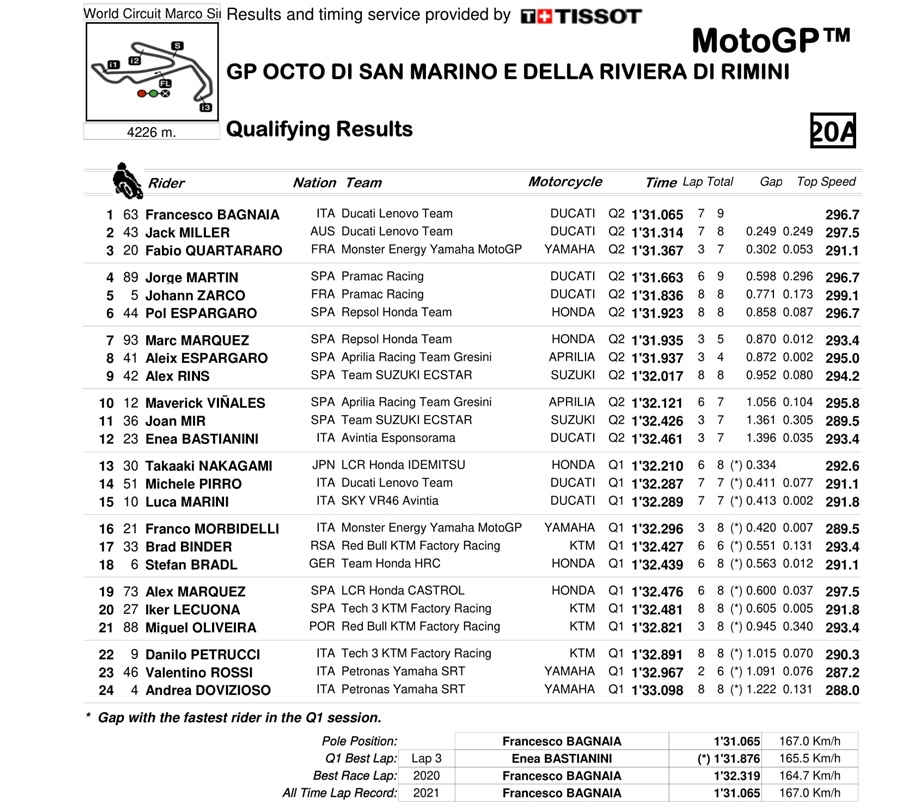 Berikut Hasil Kualifikasi MotoGP Misano 2021: