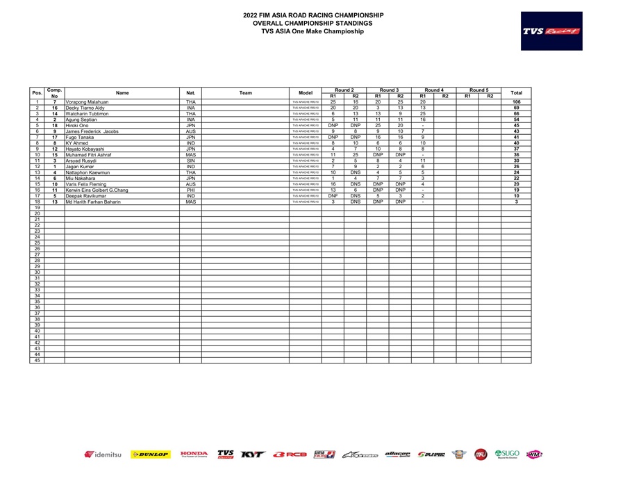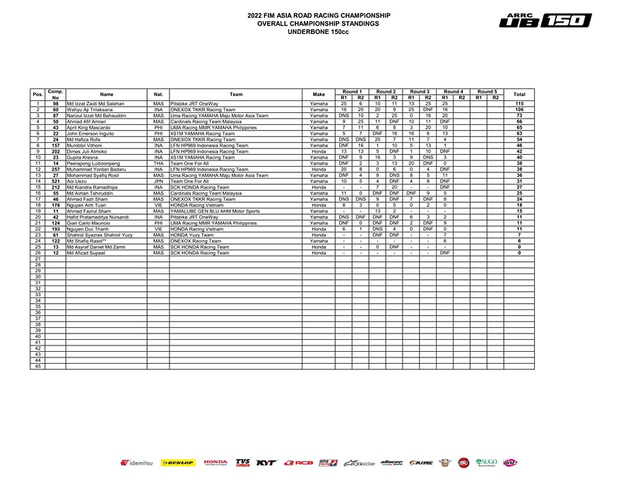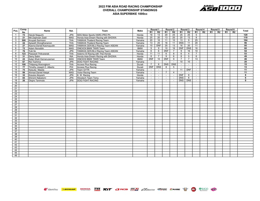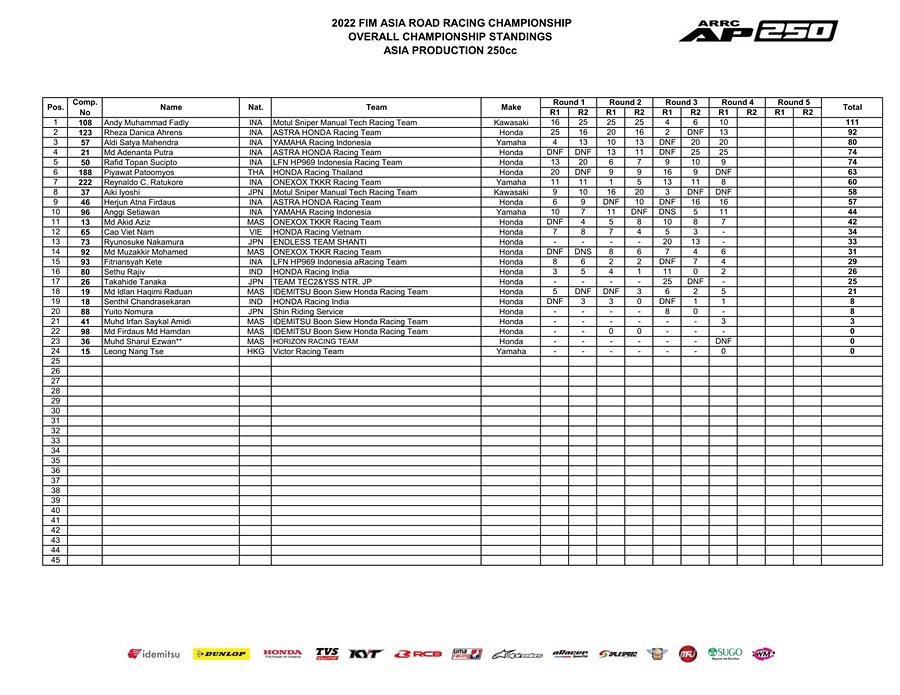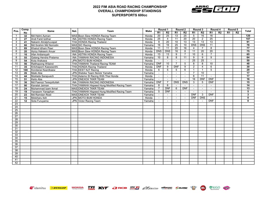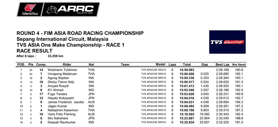 BalapMotor.Net – Berikut kami paparkan hasil lengkap Race 1 kejuaraan Asia Road Racing Championship (ARRC) putaran ke-4 yang berlangsung di sirkuit Sepang, Malaysia pada Sabtu 8 Oktober 2022.