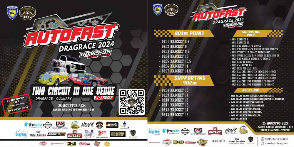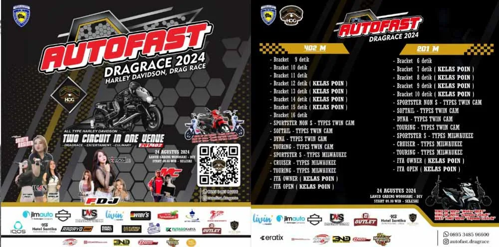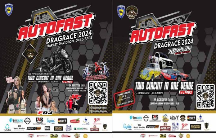 “Auto Fast 2024 adalah event Dragrace khusus Harley Davidson dan Dragrace (roda 4) yang diselenggarakan oleh HOG Kalimas Solo Chapter pada tanggal 24 – 25 agustus 2024 bertempat di Lanud Gading, Wonosari, DIY,” ungkap Deon.