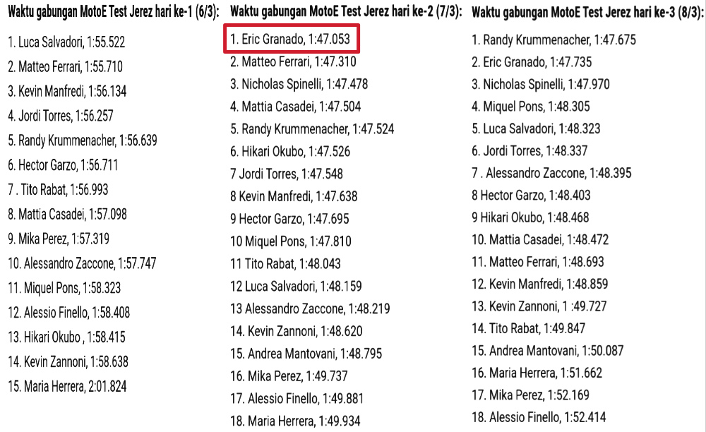 Pelakunya adalah Eric Granado. Pembalap yang tahun ini juga bertarung di kejuaraan dunia superbike itu mencetak waktu tercepat 1:47,053 detik. Padahal Eric sendiri baru mencoba di hari kedua lantaran baru tiba dari Indonesia.