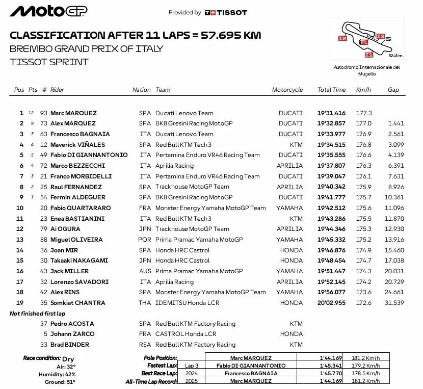 Sementara tiga besar terbaik kembali ditempati oleh Alex Marquez dan Francesco Bagnaia. Hasil sprint ini sudah kesekian kalinya di tahun 2025. (**)