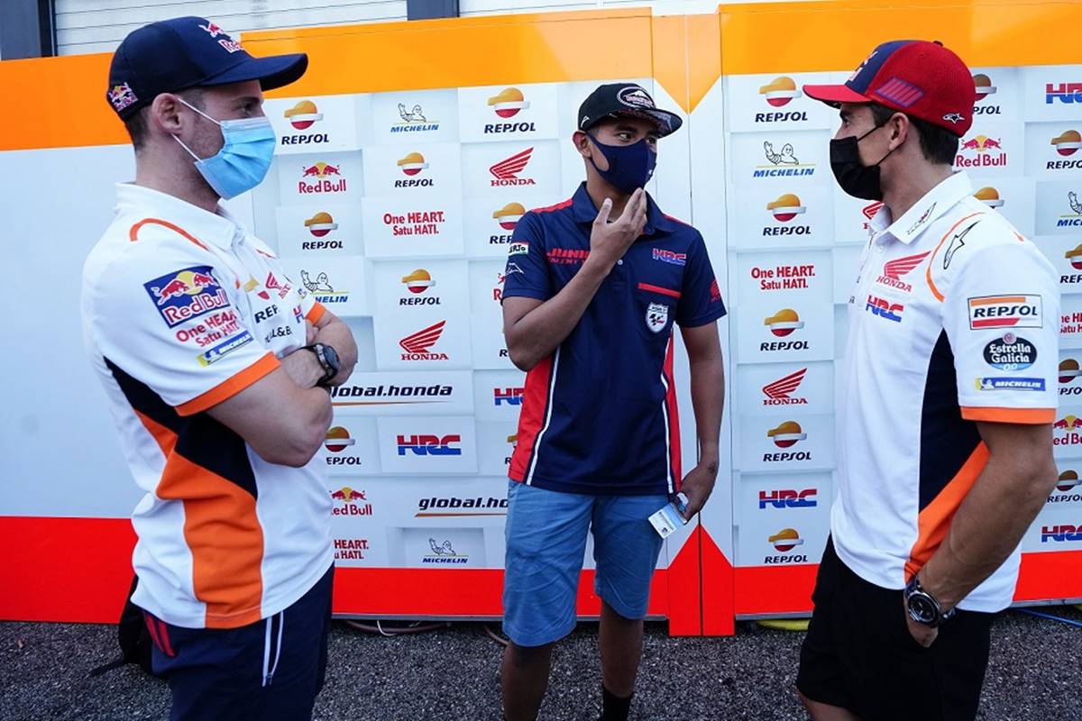 BalapMotor.Net – Mario Suryo Aji, pembalap Astra Honda Racing Team yang berlaga di FIM CEV Moto3 Junior World Championship, mendapat suntikan motivasi langsung dari pebalap MotoGP menjelang balapan di Misano World Circuit Marco Simoncelli, Italia (17/9). Dua pebalap Repsol Honda Team, Marc Marquez dan Pol Espargaro, yang balapan di ajang balap dunia MotoGP memberikan semangat pada pemuda asal Magetan, Jawa Timur ini agar tidak pantang menyerah dalam memperjuangkan mimpinya.
