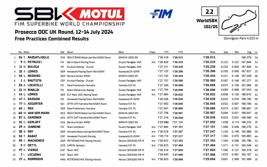 Pembalap Barni Spark Racing Team tersebut diluar dugaan menempati posisi kedua tercepat. Petrucci jadi pembalap Ducati terbaik di bawah dominasi Toprak Razgatlioglu.