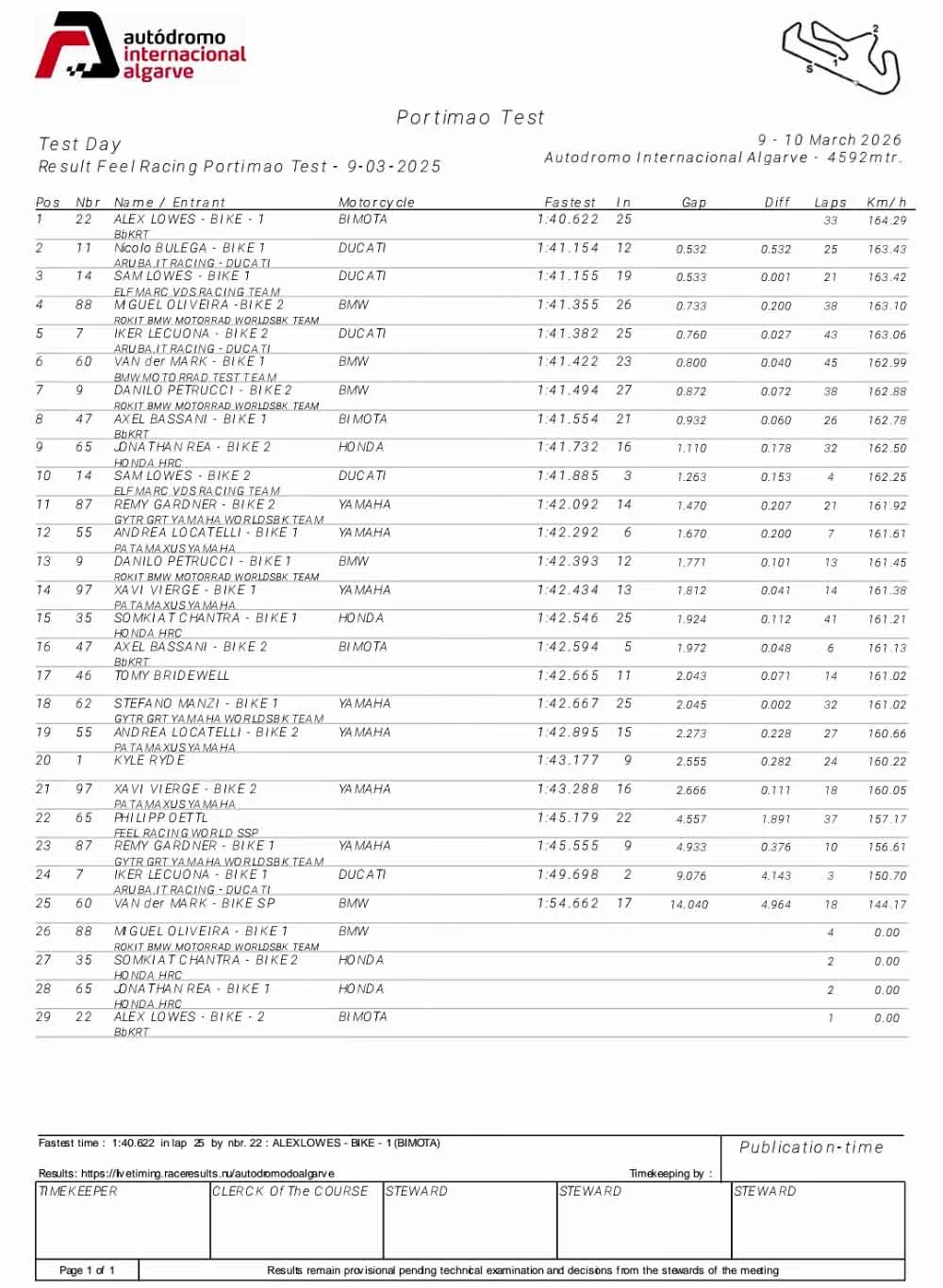 BalapMotor.Net – Alex Lowes menjadi pembalap tercepat pada tes WorldSBK hari pertama yang berlangsung di Autódromo Internacional do Algarve, Portimao, Portugal (9 Maret).