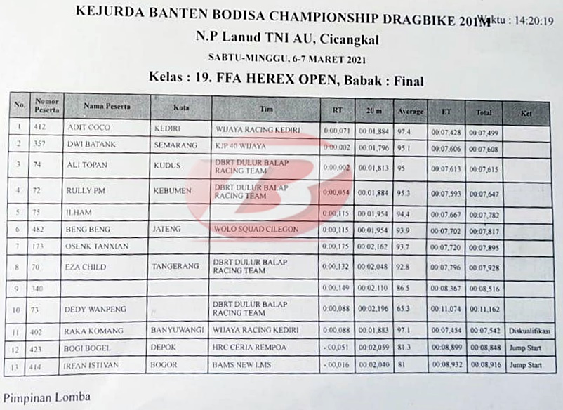Adit Coco yang berasal dari Kediri menorehkan waktu 7,499 detik, sementara Dwi Batank asal Semarang menuliskan 7,608 detik. Soal waktu sendiri katanya belum maksimal karena masih jauh dari saat setting.