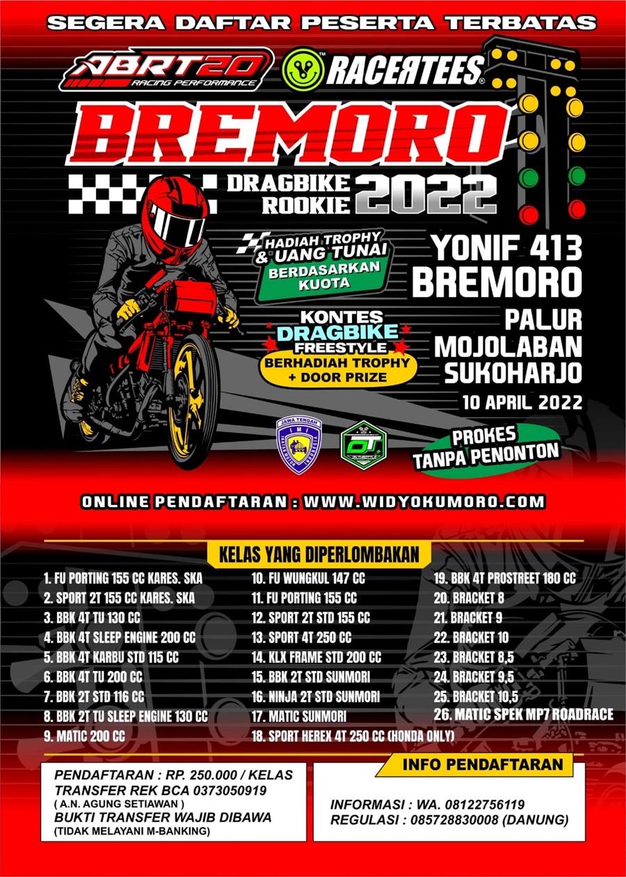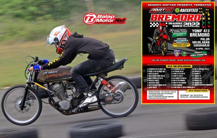 Namun ini khusus pemula. Dengan tajuk Bremoro Drag Bike Rookie 2022 yang akan berlangsung pada tangga 10 April di sirkuit NP. Yonif 413 Bremoro Palur, Mojolaban, Sukoharjo.