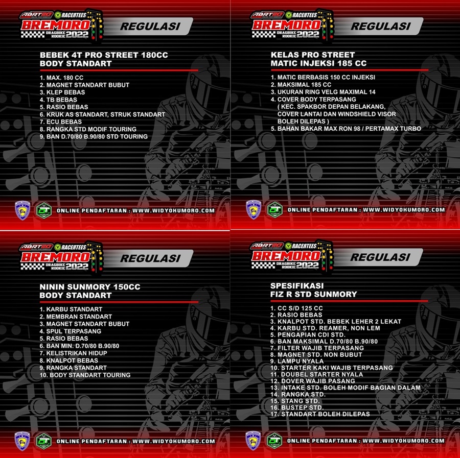 Kejuaraan rookie yang disponsori oleh ABRT20 Racing Exhaust dan Racertees tersebut siap melombakan kelas-kelas Special. Banyak kelas baru yang jarang kita temui khususnya seputaran event Dragbike di Jawa Tengah.