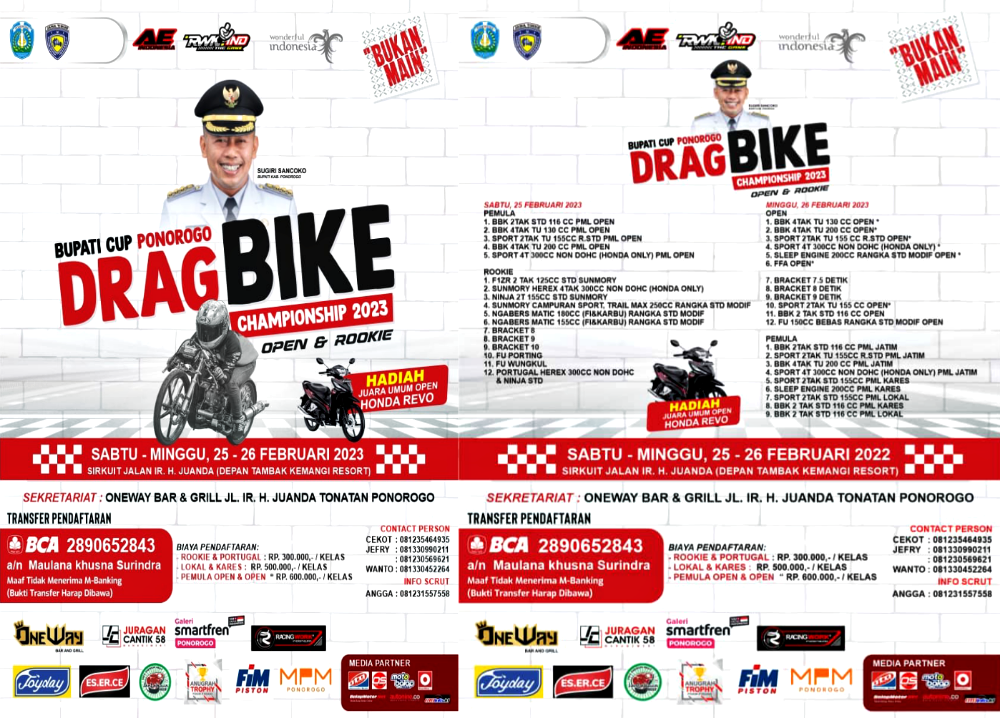 BalapMotor.Net – Kejuaraan balap lurus 201m di Jawa Timur akan kembali tersaji akhir pekan ini (25-26 Februari). Kali ini dengan titel Bupati Cup Ponorogo Drag Bike Open & Rookie Championship 2023.