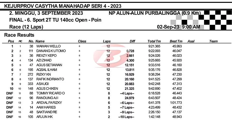 Akan tetapi, pembalap yang mengusung bendera East Wood tersebut tetap mempertahankan posisi terbaik hingga finis. Tentu saja ini menjadi bukti ketangguhan Wello di trek dadakan. (***)