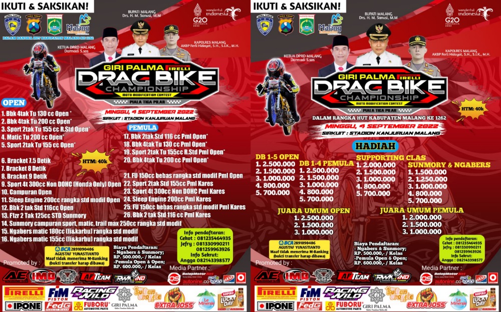 BalapMotor.Net – Jawa Timur akan kembali menghelat kejuaraan balap lurus dengan hadiah yang menggiurkan. Yaitu event Giri Palma Firelli Dragbike Tiga Pilar yang akan berlangsung di sirkuit NP. Stadion Kanjuruhan, Malang.