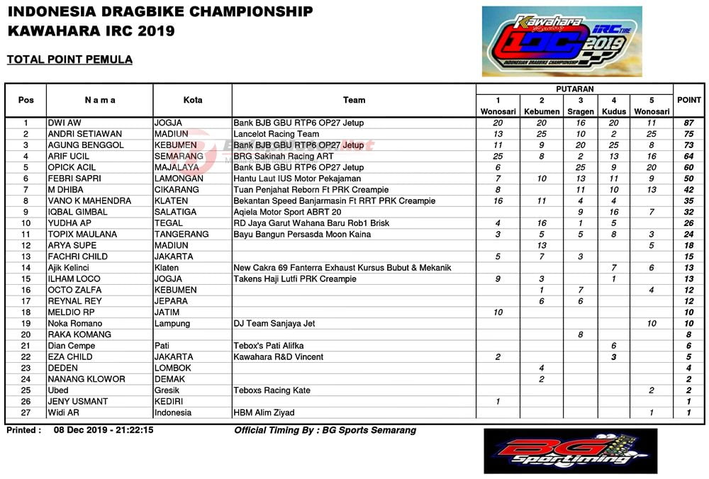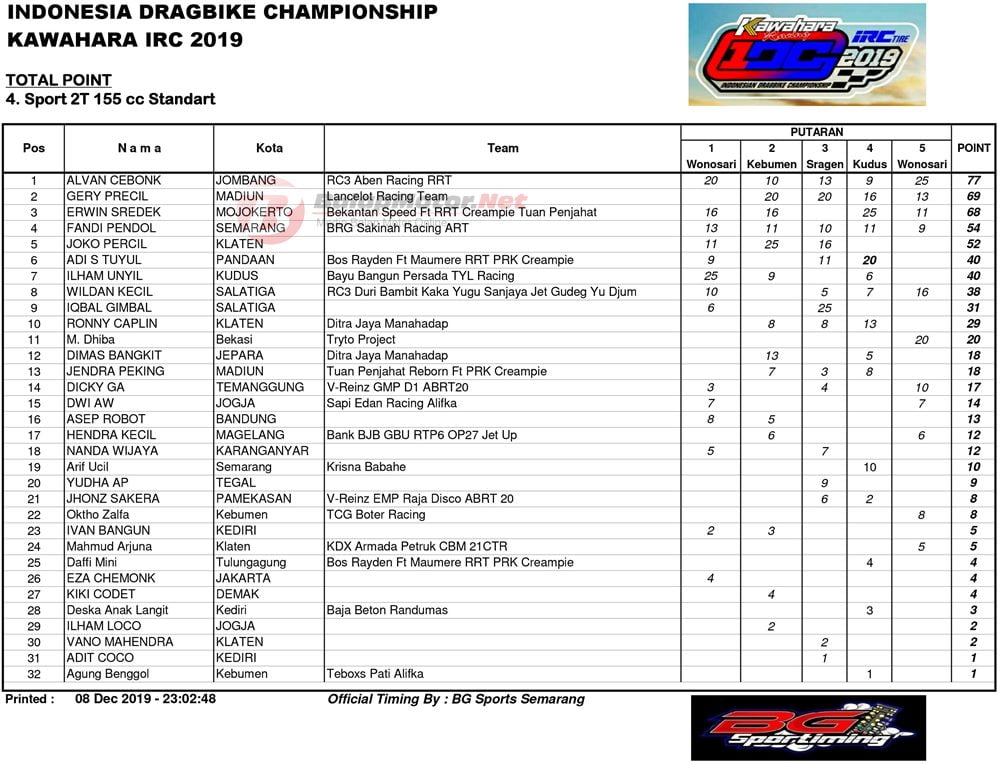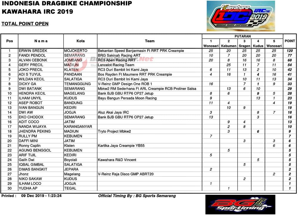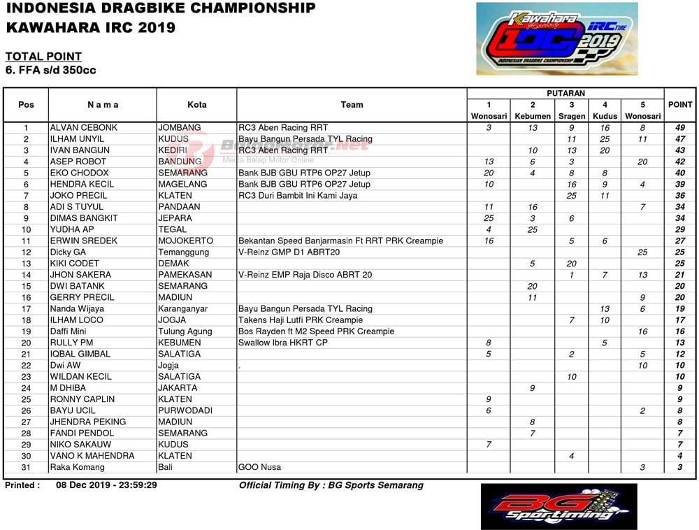 Juara umum pun sudah dipastikan pada event drag bike paling bergengsi ini. Selain juara umum total poin, ada juga juara umum per-kelas poin. Ada 8 kategori kelas yang di poinkan.