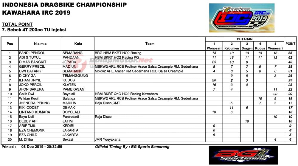 BalapMotor.Net – Kejuaraan Kawahara IRC Indonesia Drag Bike Championship (IDC) 2019 akhrinya selesai sudah. Partai finalnya berlangsung di sirkuit NP. Lanud Gading, Wonosari, Gunung Kidul pada Minggu 8 Desember 2019.
