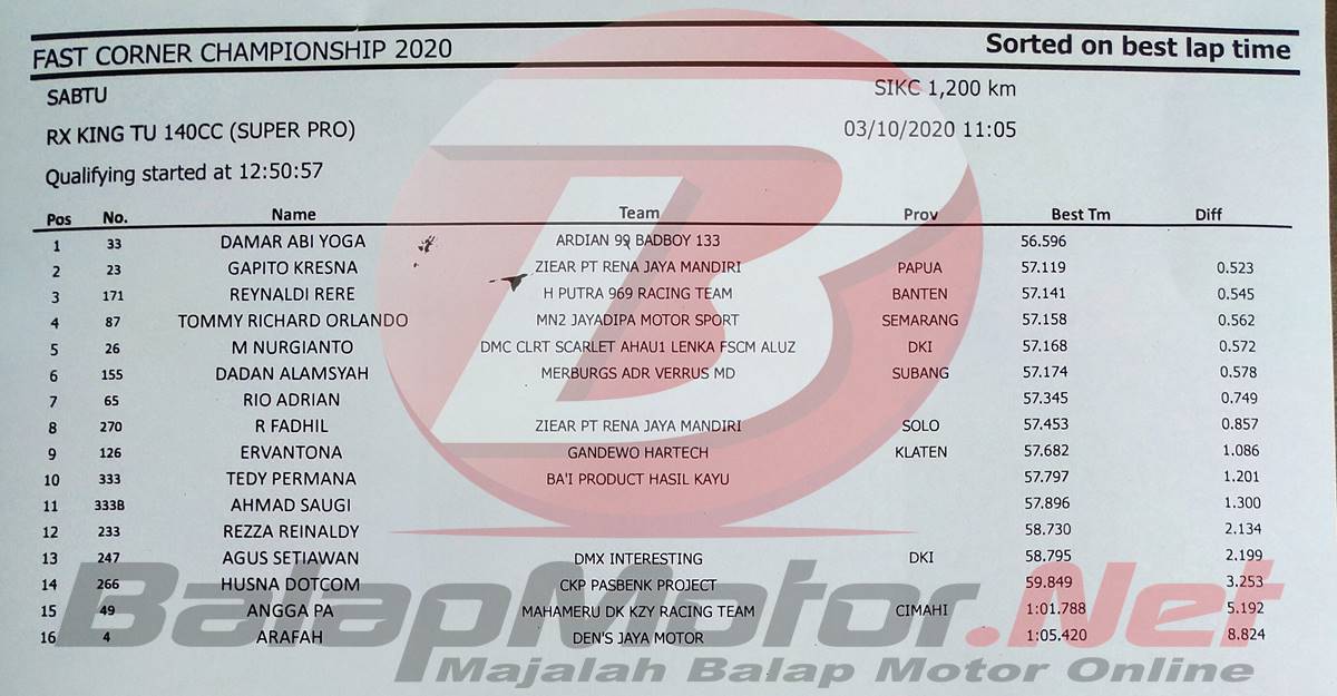 BalapMotor.Net – Kejutan datang dari sesi QTT kelas RX King TU 140cc Super Pro gelaran Fast Corner Championship 2020 (2/10). Damar Abi Yoga mampu menjadi yang tercepat dalam sesi QTT kelas unggulan tersebut.
