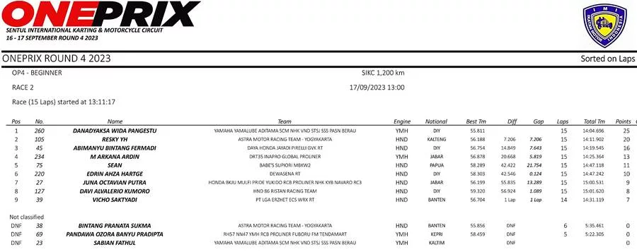 BalapMotor.Net – Pertarungan Race 2 di kategori beginner pada putaran keempat Oneprix yang berlangsung di sirkuit Sentul Karting, Bogor kembali berjalan sengit.