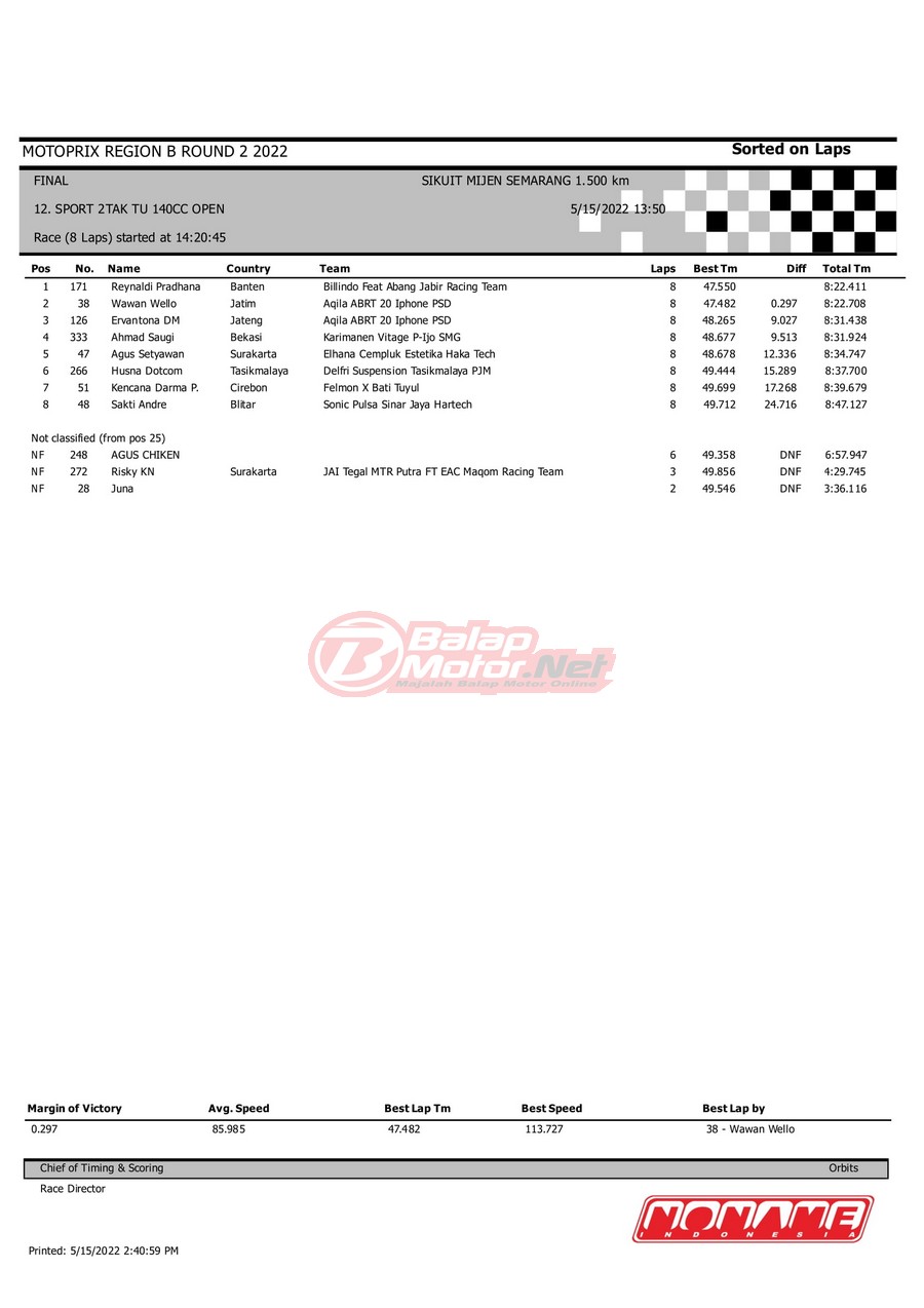BalapMotor.Net – Pertarungan Sport TU 140cc dalam kejurnas Motoprix Region B putaran kedua yang berlangsung di sirkuit Mijen, Semarang berhasil dikuasai oleh RX-King Billindo ft. Abang Jabir Racing Team.